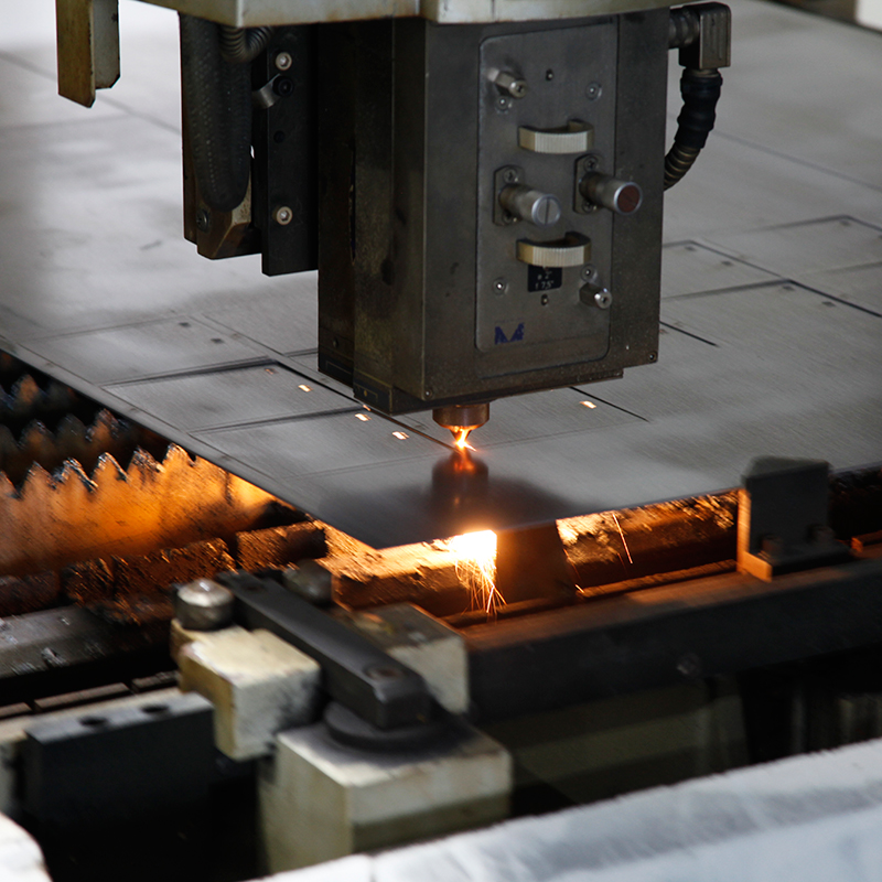 レーザー切断加工で資材からの切り出しができます。材料となる金属板は4×8サイズまで対応できます。レーザー切断の対応範囲は下記の表を参照してください。